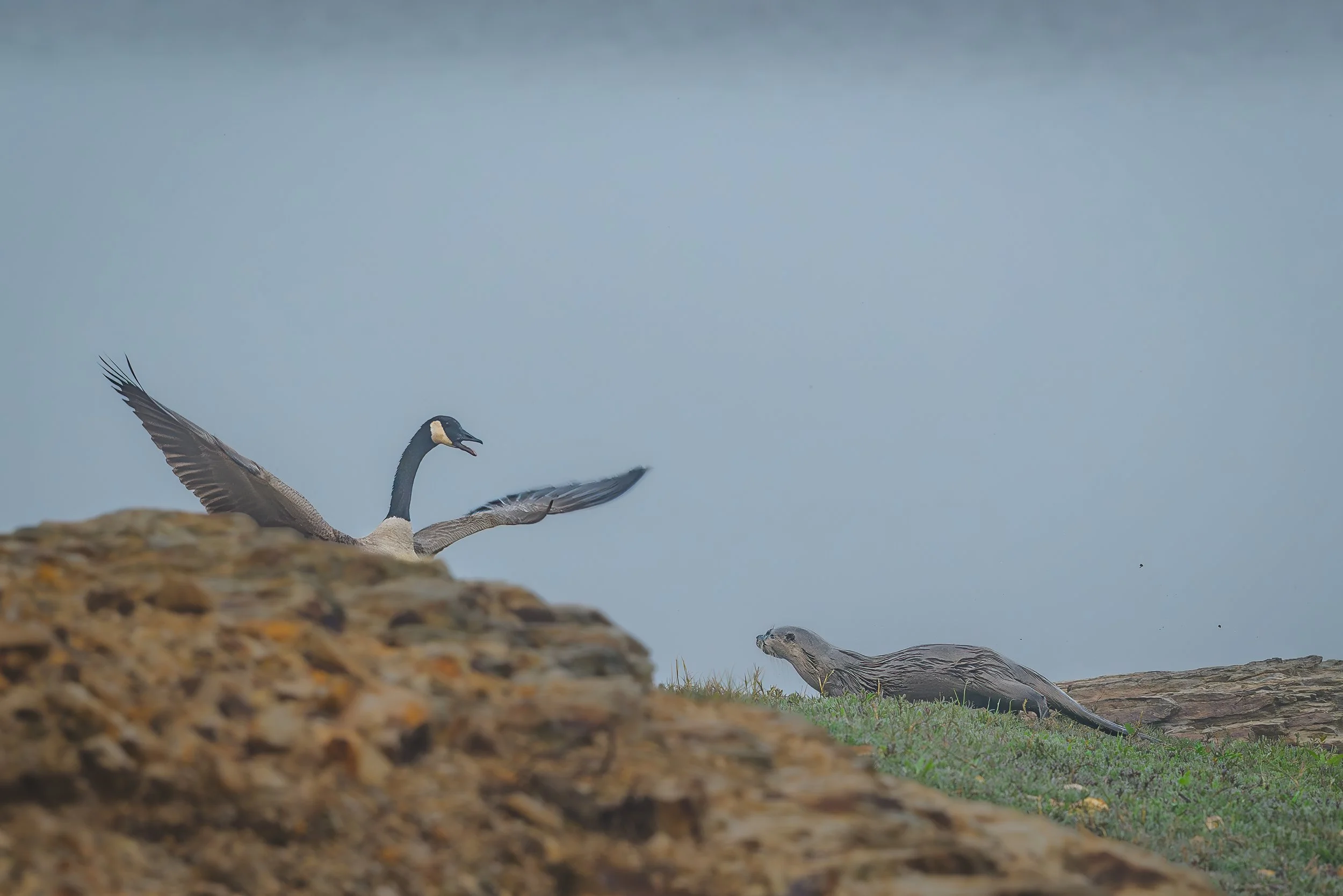 I already posted some of the shots of the River Otter here: https://www.chamberlinnature.com/blog/river-otter-pt-reyes-041624 and now here is the sequence where it charged at some Canada Geese. The otter originally was just rolling in the sand, enjoying itself and then he quickly entered the water and seemed to be on a mission. It wasn’t clear to me at first what he was doing until he launched out of the water right at a pair of Canada Geese. I wouldn’t have expected the otter to go after the Geese, as they seemed a bit too large for him. But a little bit of research afterward indicates they do indeed occasionally go after and can kill geese. But these geese were having none of that. One goose ran away into the water while the other stood its ground and gave the otter an earful. Once the goose in the water had a little distance, it turned and gave the otter an earful too. The otter sized up the situation and decided he was more comfortable in the water so launched back in the water. At that point both geese took to the air and as quickly as the action had started, it came to a close.